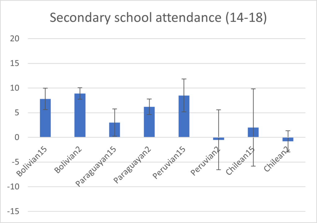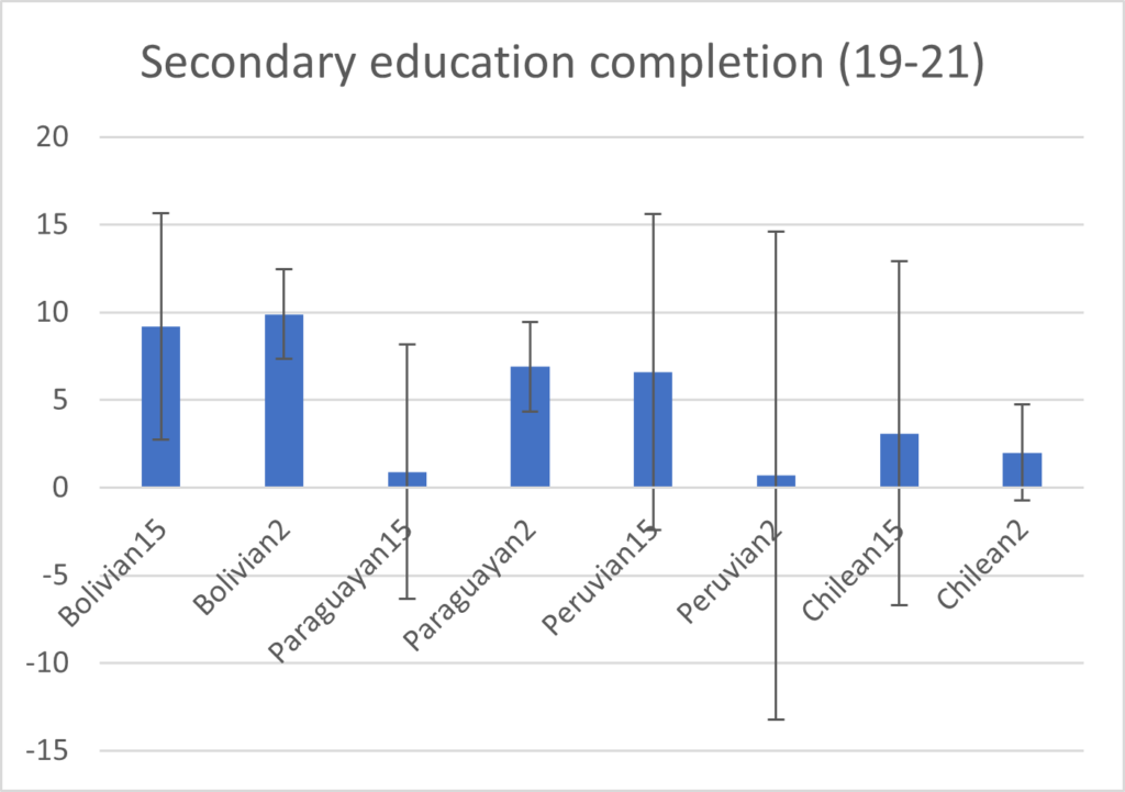 These results can be observed in Figure 1, which illustrates the findings for two key indicators: secondary school attendance among 14–18-year-olds and secondary education completion for those aged 19–21. Migrant-origin children show attendance and completion rates 3% to 10% points higher than their native Argentine peers. For example, 2nd generation Bolivians are around 9% points more likley to attend secondary education and 10% points more likley to have finished this level than native Argentines, on average.