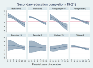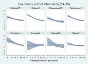 Migrant-origin children from families with low levels of parental education demonstrate a marked advantage over native Argentines with similar backgrounds, especially those with Bolivian and Paraguayan origins. For example, 2nd-generation Bolivian and Paraguayan children with parents having 7 years of education (which approximates primary education) are around 10% points more likely to attend secondary school than native Argentines with equally educated parents.